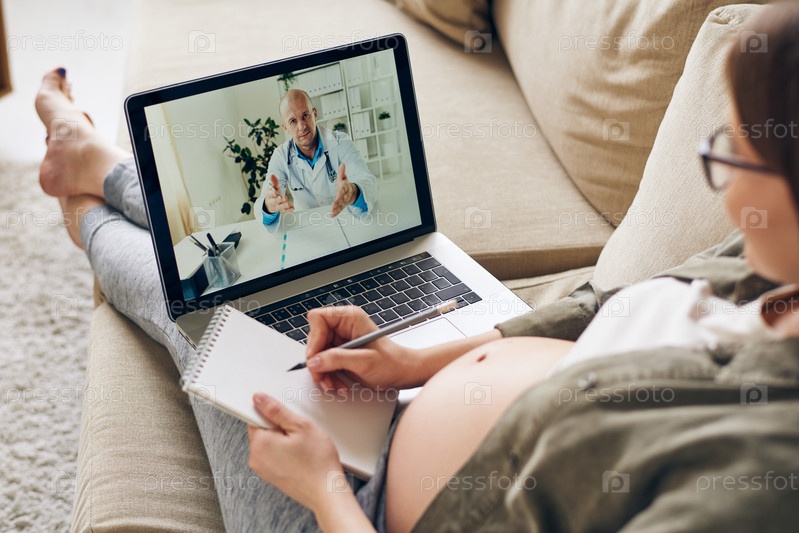 Профессиональный врач на экране ноутбука консультирует молодую беременную женщину