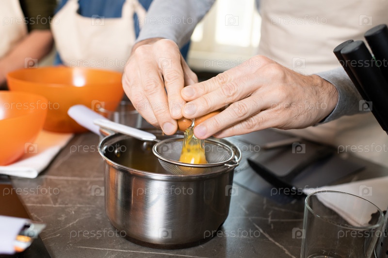 Руки старшего мужчины в фартуке ломают яйцо на сито над металлической сковородой у стола