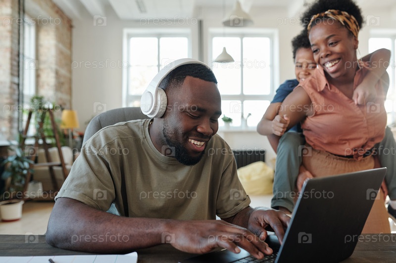 Счастливая молодая жена менеджера домашнего офиса и их милый маленький сын веселятся