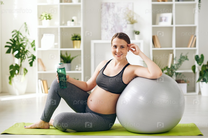 Молодая успешная спортивная беременная женщина с бутылкой воды, сидящая у фитбола