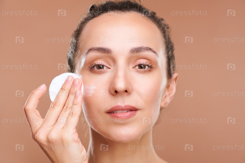 Молодая женщина с хлопковой подушкой, наносящая лосьон или сыворотку для лица на нижнюю часть тела