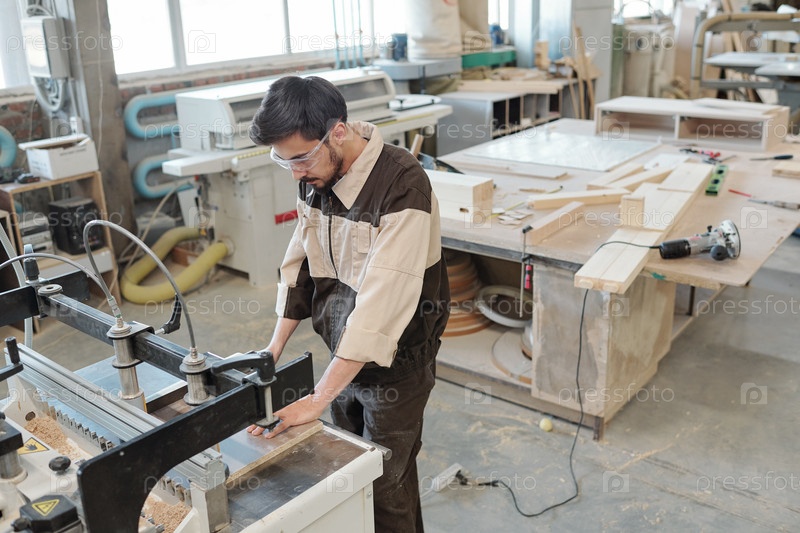 Старший работник фабрики, сгибающей промышленную машину для обработки древесины