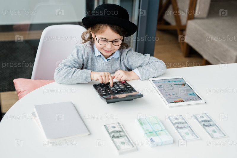 Маленький бухгалтер, использующий калькулятор во время подсчета зарплаты или денег