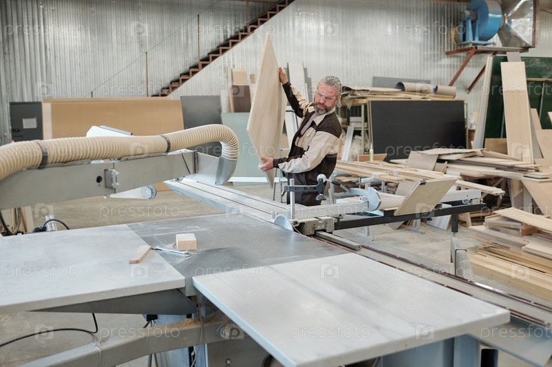 Старший работник в форме ставит большую тяжелую деревянную доску на промышленные машины