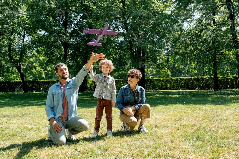 Счастливый молодой человек летает на игрушечном самолете во время игры со своим очаровательным маленьким сыном