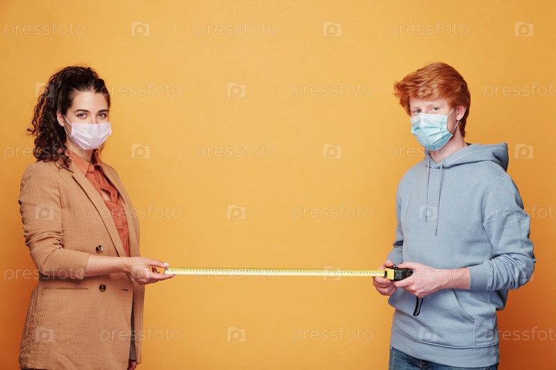 Молодая пара в защитных масках, измеряющих два метра между ними