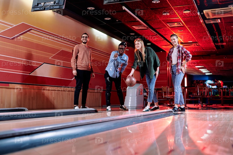Красивая девушка собирается бросать мяч, в то время как африканский молодой человек дает ей советы