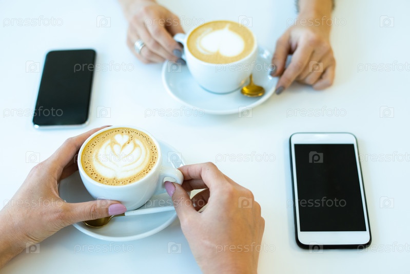 Руки двух молодых женщин, сидящих за столом и пьющих свежее вкусное капучино