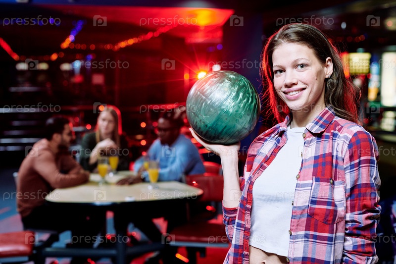 Красивая улыбающаяся девушка держит мяч для боулинга, стоя перед камерой