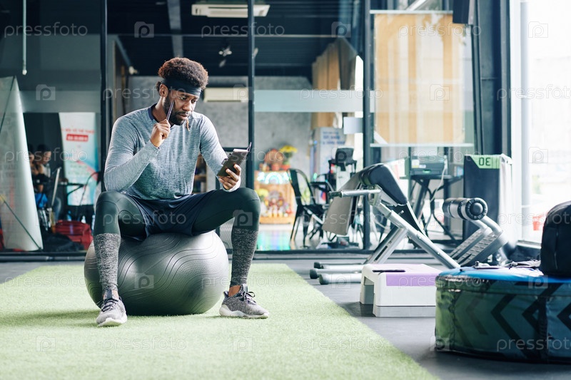 Человек, сидящий на спортивном мяче с помощью смартфона