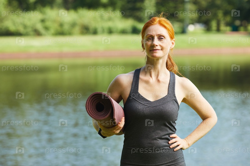 Уверенная в себе женщина с матом для йоги