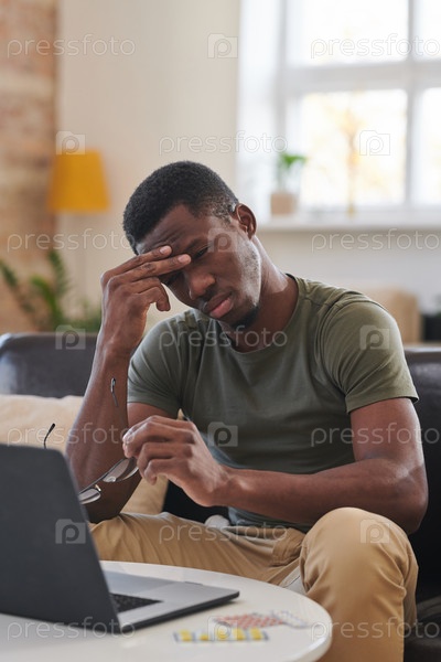 Вертикальный средний длинный снимок молодого взрослого афроамериканского мужчины, страдающего головной болью во время работы на ноутбуке дома