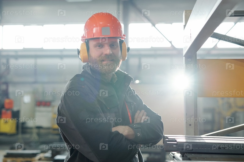 Молодой инженер-фабрика с перекрестным оружием в рабочей одежде, шляпе и наушниках