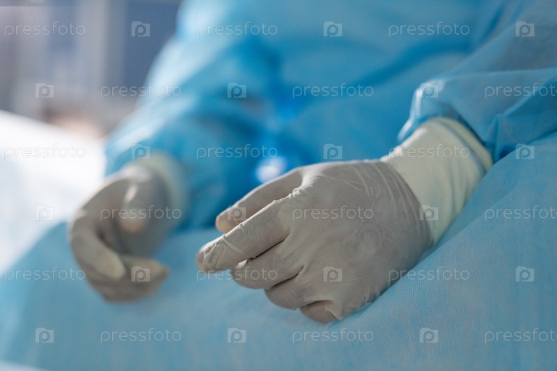Перчатки рук усталого профессионального хирурга, сидящего в операционной во время перерыва