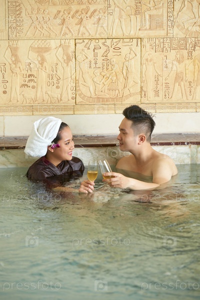 Пара пьет шампанское в горячей ванне