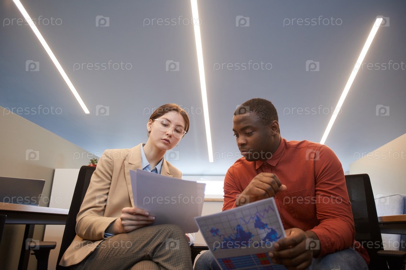 Два современных бизнесмена обсуждают документы в футуристическом интерьере