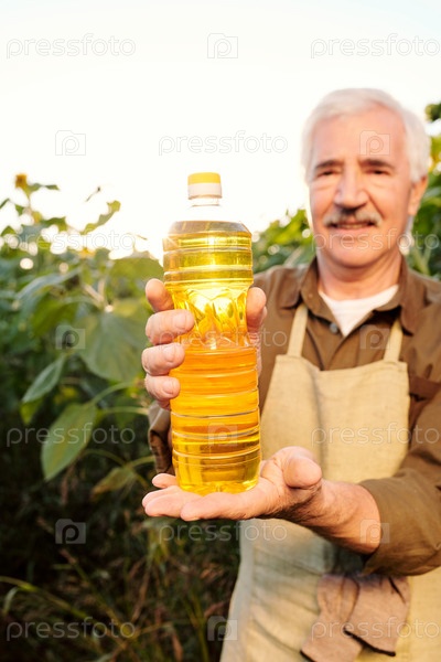Старший фермер в рабочей одежде показывает бутылку свежего домашнего подсолнечного масла