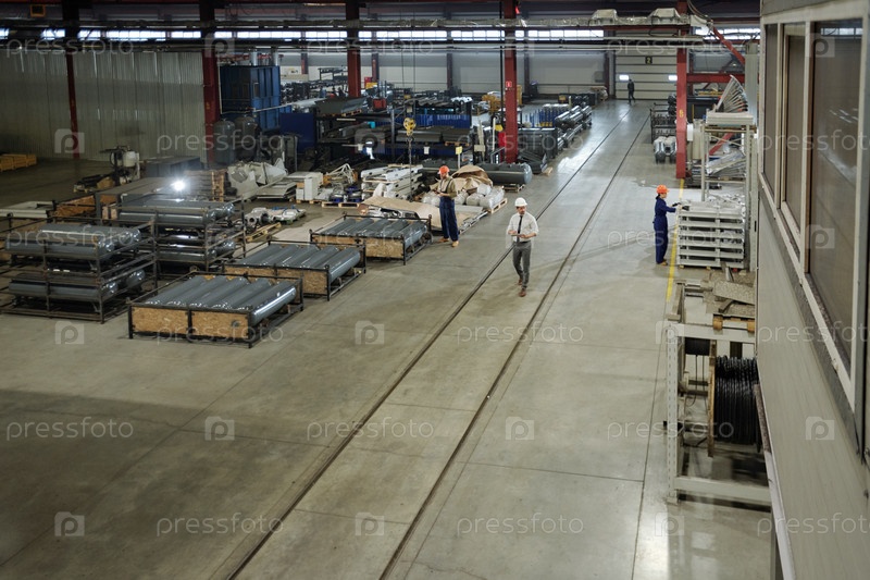 Большая мастерская современного промышленного завода с группой работающих инженеров