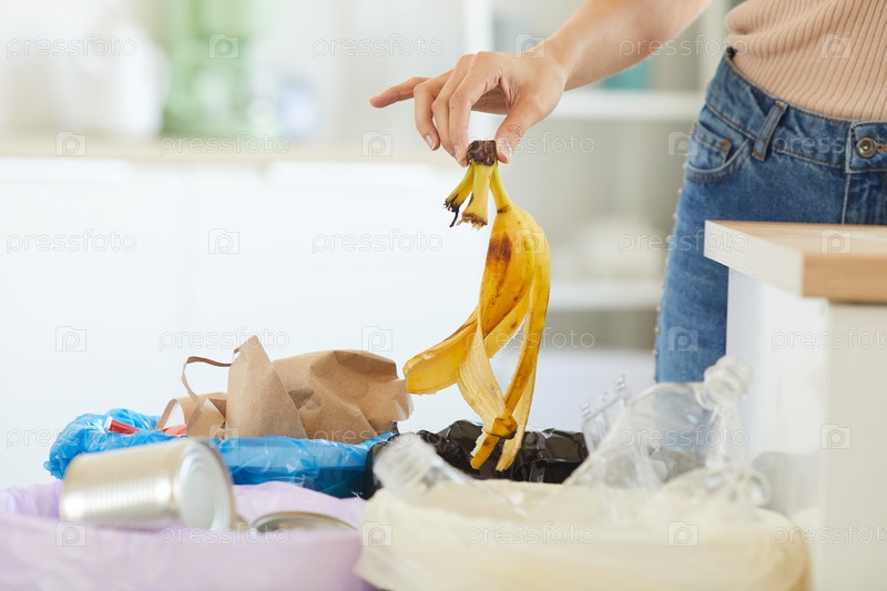 Женщина выбрасывает отходы в мусорные баки