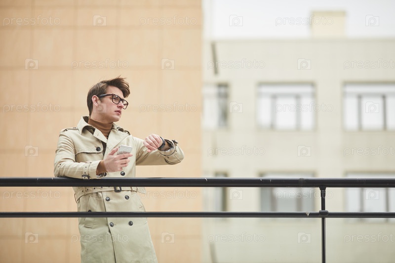 Молодой бизнесмен ждет на улице в городской обстановке