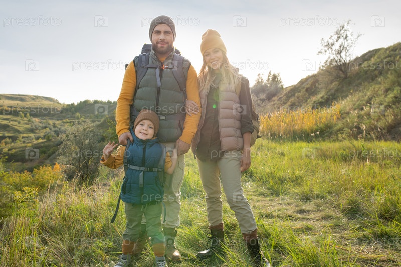 Молодые родители и их очаровательный маленький сын с рюкзаками, стоящие на траве