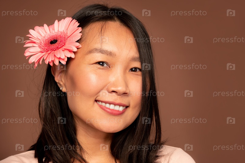 Счастливая молодая азиатская женщина с красивой розовой герберой в длинных темных волосах
