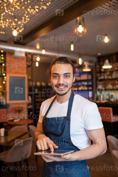 Молодой дружелюбный официант из классного ресторана прокручивает онлайн-заказы
