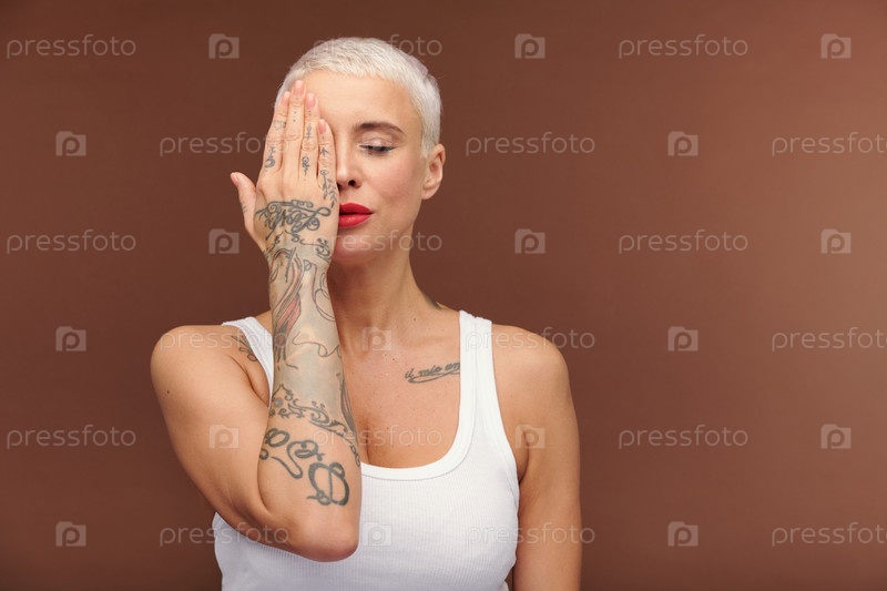 Блондинка держит руку за правый глаз и показывает руку, покрытую татуировками