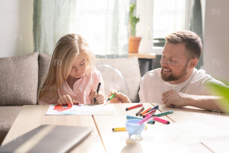 Счастливый молодой человек с зеленым выделителем, указывающим на картину, нарисованную маленькой девочкой