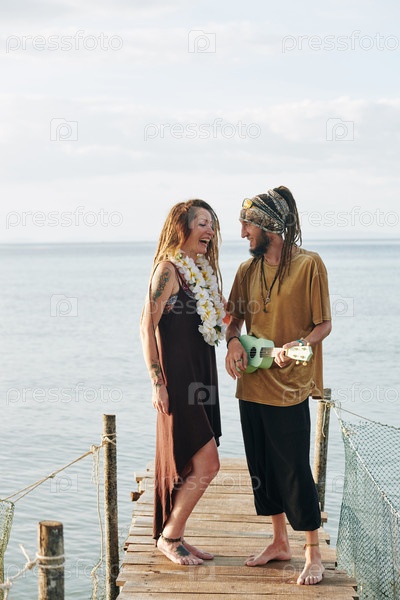 Мужчина играет на укулеле для жены
