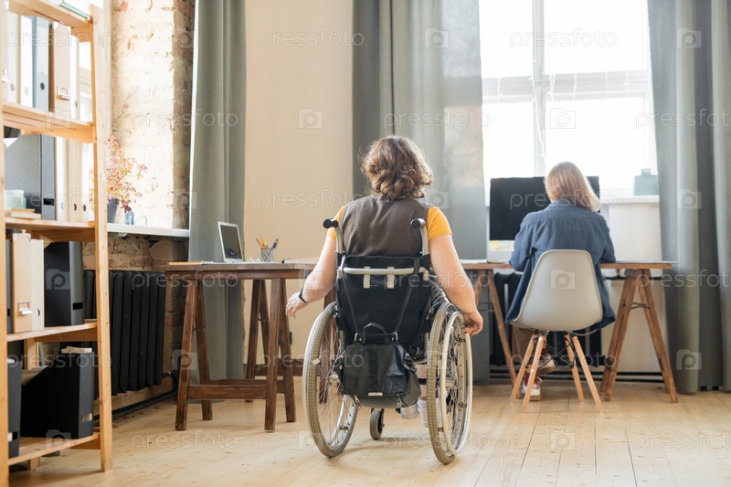 Обратный вид молодой женщины-инвалида в инвалидном кресле, движущейся по одному из столов