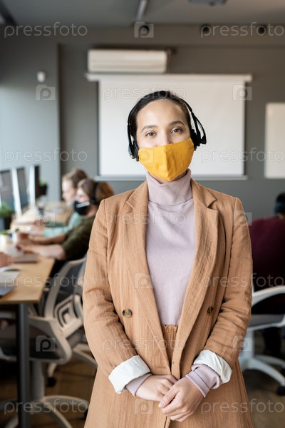 Молодая брюнетка-бизнесменка смешанной расы в защитной маске и повседневной одежде
