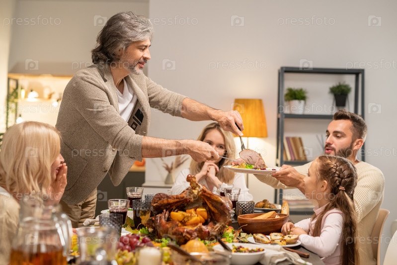 Зрелый мужчина с ножом и вилкой дает кусок жареной индейки молодому самцу