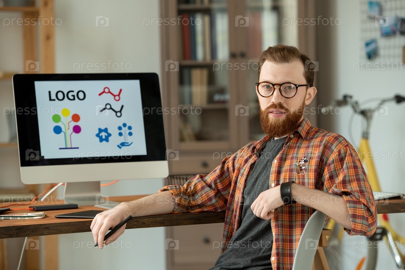 Успешный дизайнер-мужчина сидит на стуле у стола с компьютерным монитором