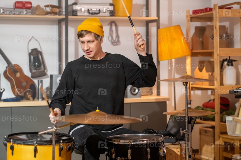 Молодой человек в джинсах, майке и желтой шапочке держит барабанные палки над барабанами