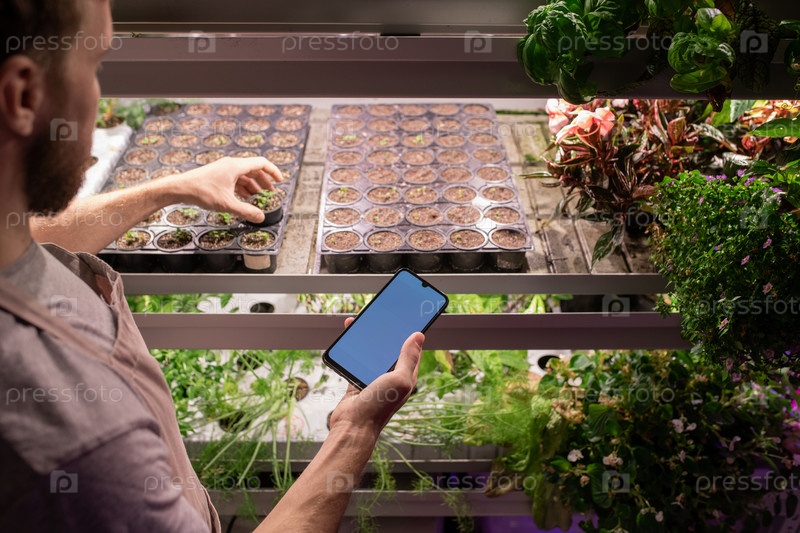 Молодой современный фермер-мужчина или селекционист, прокручивающий смартфон
