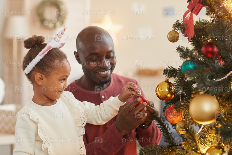Маленькая девочка украшает рождественскую елку с папой