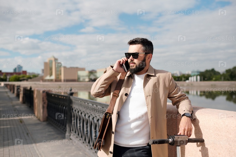 Молодой бородатый бизнесмен разговаривает со своим смартфоном, стоя на берегу реки