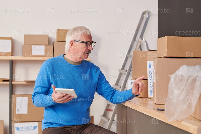 Загруженный вдумчивый старший человек с очками сидит за столом и использует планшет, считая коробки на складе
