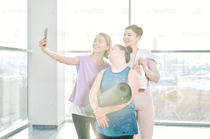 Три молодых дружелюбных женщины в спортивной одежде смотрят на камеру смартфона