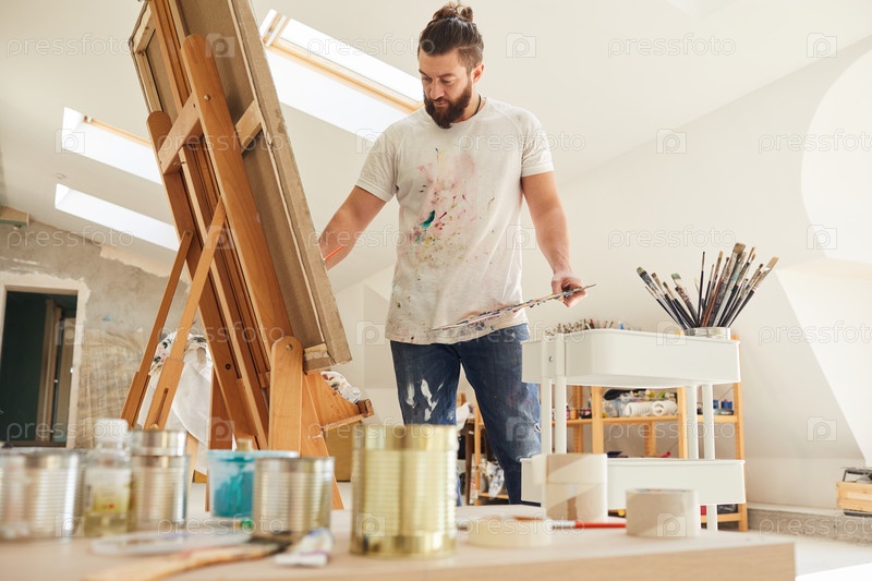 Зрелый мужской художник рисует картину в студии