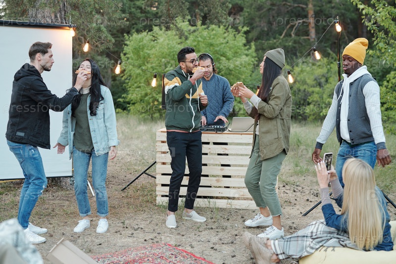 Молодые веселые друзья разных этнических групп, которые едят пиццу и танцуют на свежем воздухе