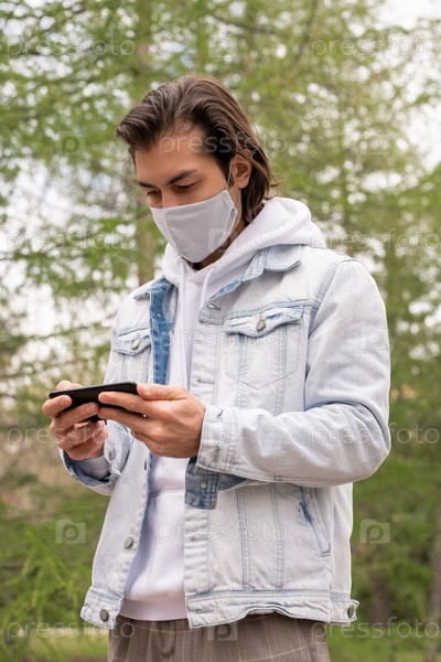 Загруженный молодой человек в повседневной одежде и защитной маске, использующий смартфон в парке