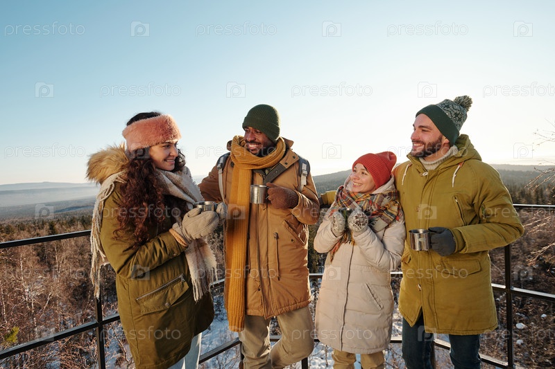 Счастливые межкультурные друзья в зимней одежде пьют горячий чай, отдыхая