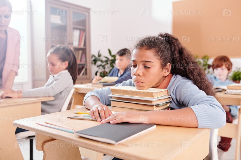 Скучная школьница смешанной расы в повседневной одежде, держащая подбородок на вершине стола книг