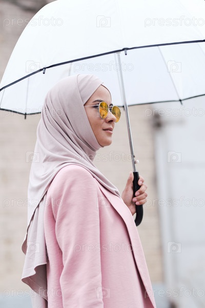 Молодая стильная мусульманка в хиджабе, солнцезащитных очках и кардигане с зонтиком