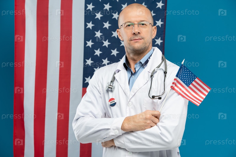 Уверенный врач средних лет в очках и белом халате, держащий маленький американский флаг