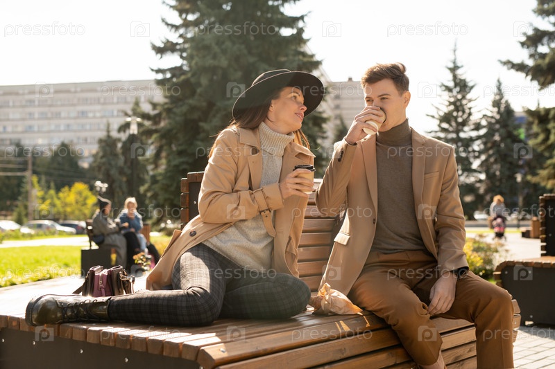 Молодая спокойная женщина смотрит на своего парня, пока оба пьют кофе на скамейке