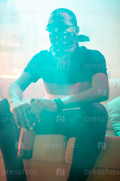Молодой человек африканской этнической принадлежности в солнцезащитных очках, повседневной одежде и пандане с черным лицом