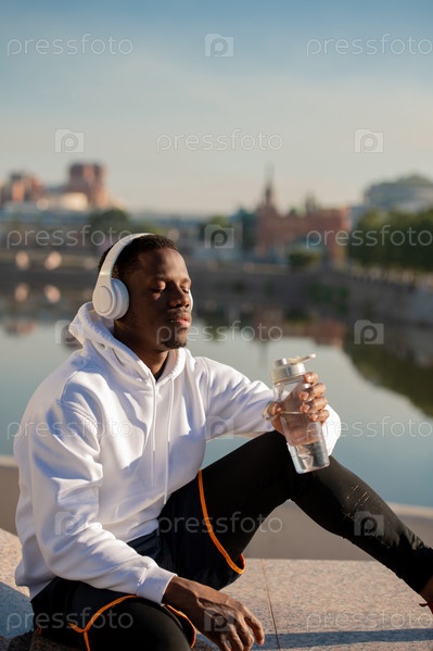 Счастливый молодой африканский спортсмен в наушниках пьет после тренировок на свежем воздухе